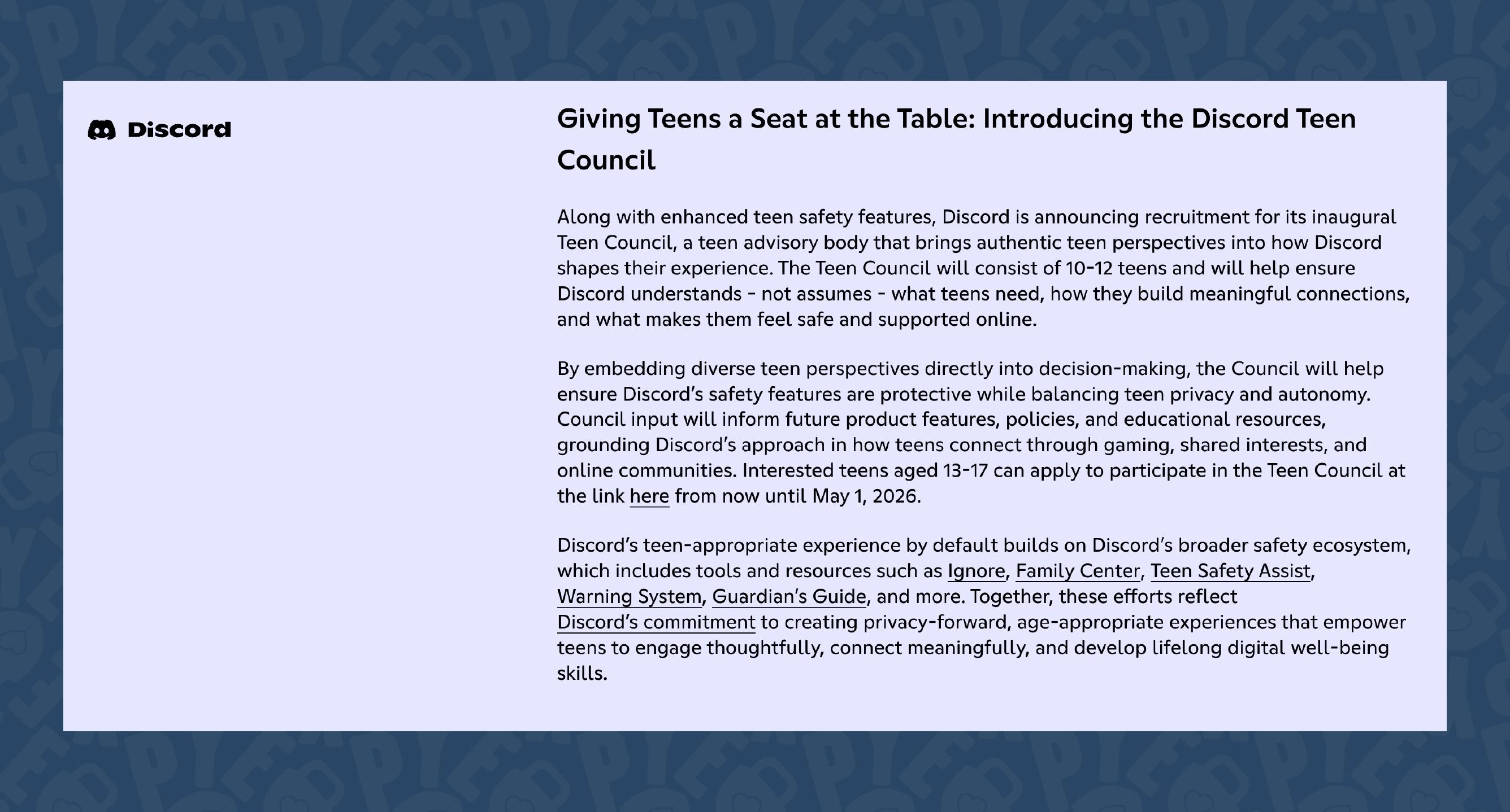 Remember, Discord didn't make any real changes for parental controls until after being on NCOSE’s “Dirty Dozen” list for 3 years in a row. In 2025, They added the Family Center with Parental Controls, which specifically restricted AI generated CSAM, and much more. To see all the detailed changes, click here.